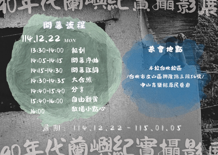二、 活動相關資訊: (一)展出期程:114年12月22日(星期一)至115年1月5日(星 期一)。 (二)開幕時間:114年12月22日(星期一),下午14:00。 (三)展出地點:本校中山育樂館學務處原民藝廊。 (四)報名方式:https://forms.gle/au9Xmsde8AAsWCM17 (採網路報名)。
